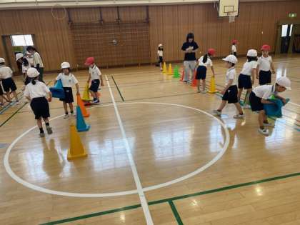 2年生の体育では、準備運動のあと、自分たちでケン・パーのコースと、コーンのコースを作りました。