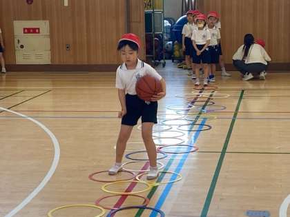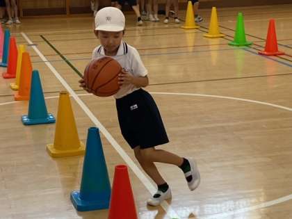 バトン代わりにバスケットボールを持って、ケン・パーをケンケンとパーとをして走ったり、コーンをジグザグに走ったりしました。