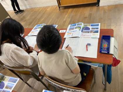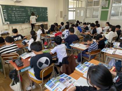 山地や平野、台地があることを学び、私たちの住んでいる大江のまちも、上町台地という台地にあることを確認していました。