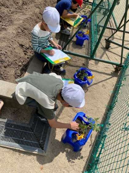 今日は特に、鉛筆や色鉛筆を使って観察記録をつけるということなので、じっくり葉っぱの様子や茎の様子を観察しながらスケッチしていました。