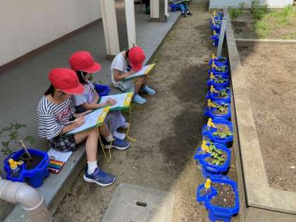 2年生の生活科では、育てている朝顔の観察をしていました。