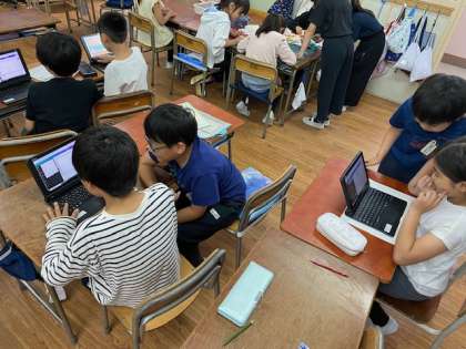 3年生の教室をのぞいてみると、何だか楽しそうに、友だちと話し合ったり学習者用端末で何かを打ったりしていました。