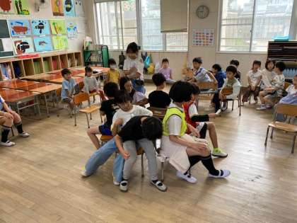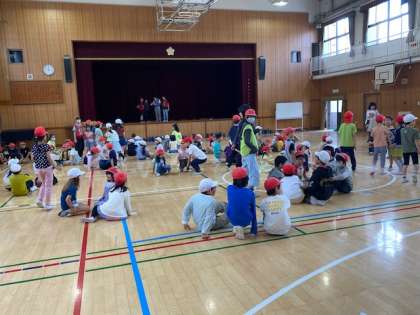 今朝の児童集会の時間は、なかよし班(1年生から6年生までの縦割り班)で企画したことをもとに遊びました。