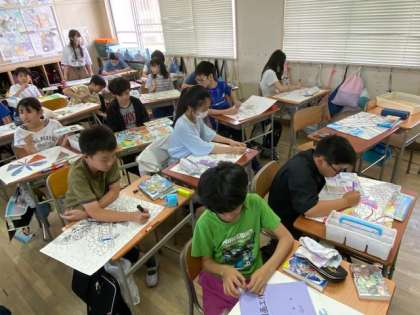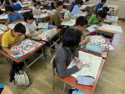 6年生の図工では『色むし図鑑』と題して、虫(甲殻類可)とデザインを融合させた絵を描いていました。