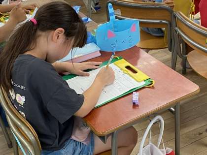 今日は互いの作品を鑑賞するために、自分の作品に込めた思いを作品カードに書いていました。