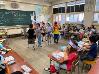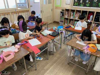 2年生の図工では、『輪っかを活かした冠』が完成し、今日はファッションショーをしました。