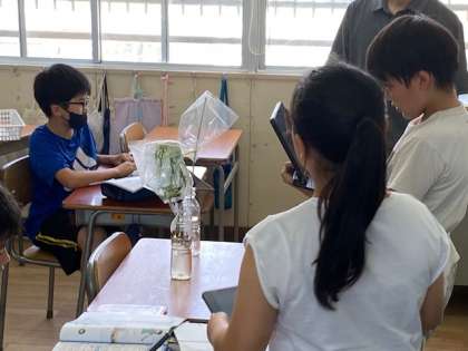 水入りのミニペットボトルに入れた2種類の植物を観察しました。