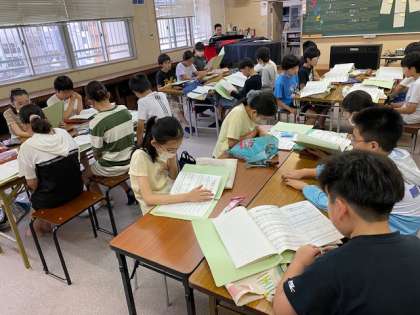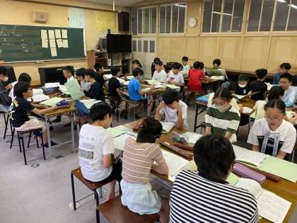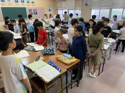 5年生の音楽では、『燃えろよ燃えろ』『今日の日はさようなら』などの林間のキャンプファイヤーで歌う曲の練習や『ともだちはいいもんだ』という歌の練習に取り組んでいました。