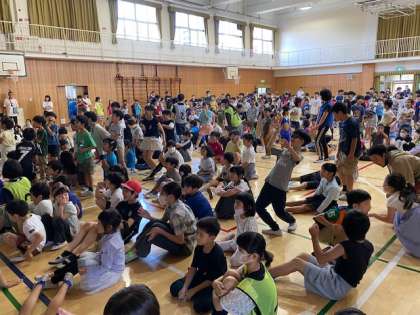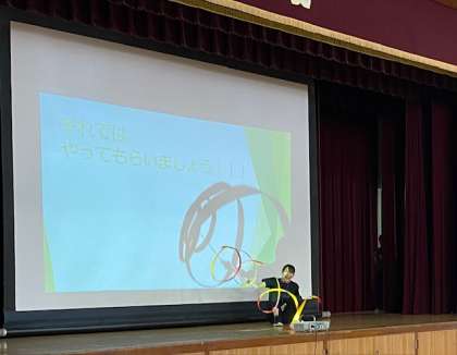 今朝の集会では、『ようこそ大江小学校へ』ということで、今年新しく大江小学校に来られた先生の得意とすることや特技を当てるクイズをしました。