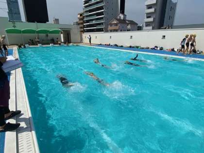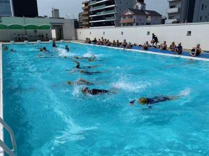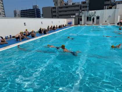 初めに、横の長さを使ってクロールや平泳ぎの感触を確かめた後、25メートルプールの縦の長さを使って泳力テストを行いました。