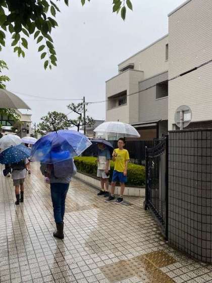 この雨の中でもあいさつ運動を元気に展開しています(^^)