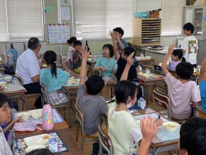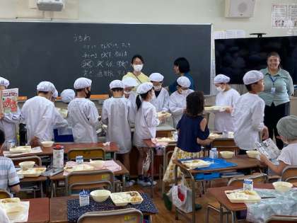 給食時間では給食の準備の様子を見学をされました。そしておいしい給食を一緒にいただきました。