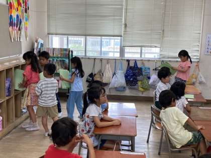 ファイルを集めたり、プリントを配ったりしていました。これは係の人が友だちの分を回収したり配ったりしているところでした。