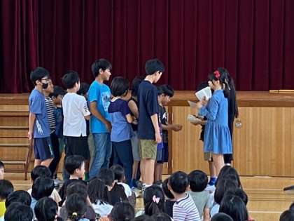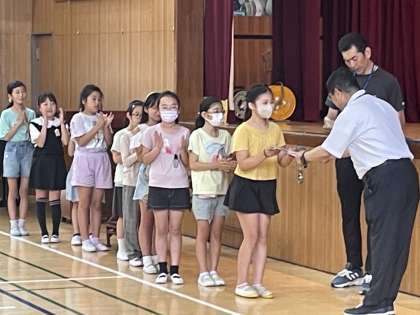 今日の児童朝会では、はじめに今日からお世話になるサポーターの先生の紹介があり、続いてバトントワリングで頑張った子たちに、校長先生から賞状が手渡されました。
