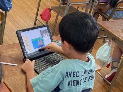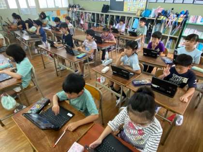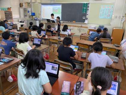 3年生の教室をのぞいてみると、プログラミング係がスクラッチというソフトで簡単なゲーム作りを教えていました。