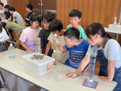 後半は、1粒0.5mmの砂粒を使い、川の水を濾過する実験をしました。