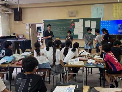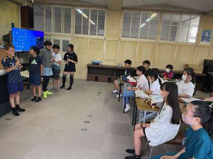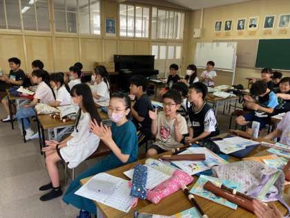リコーダーで「ソ」の音を息の続く限り吹くのですが、なかなか長続きしません。先生から長く吹くコツを教わってチャレンジ。長く吹けた子に大きな拍手が送られていました。