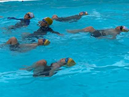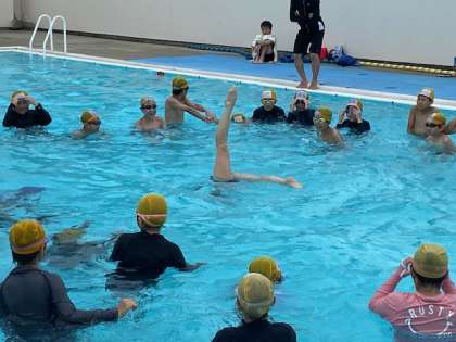 後半は水に浮かんだり、片足を上げたり、さらには足を上げたまま回転されたりと、アーティスティックスイミングの技を伝授していただきました。