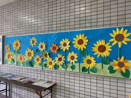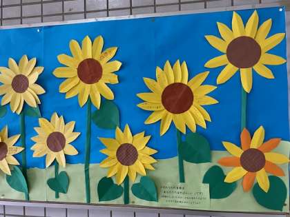 7月ということもあって、6年生が作ったひまわりが飾られています。花びら1枚1枚見ると、一人ひとりこの1学期に頑張ったことが書かれていました。