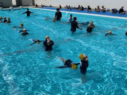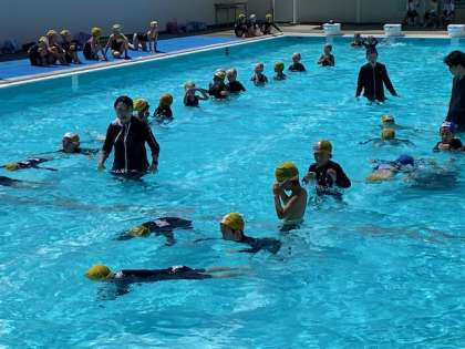 1年生のプール水泳では、水慣れ、だるま浮きと進み、今日は『大の字浮き』にチャレンジしました。