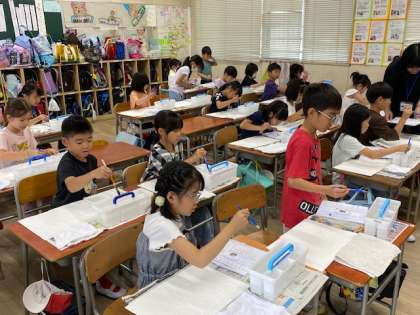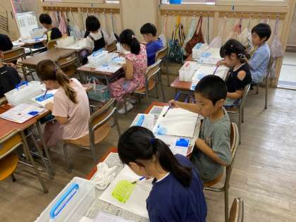 2年生の図工では、白色のパスでぐるぐる巻きの円を描き、次に、たっぷりの水で絵の具を溶き、青色や黄緑色など、好きな色を先ほどのぐるぐる巻きの上から一定方向に塗っていきました。