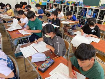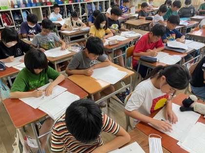 5年生の教室をのぞいてみると、今年チャレンジする漢検の練習問題に取り組んでいました。
