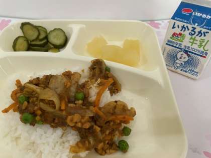大豆入りキーマカレーライス きゅうりのサラダ 洋なし(カット缶)