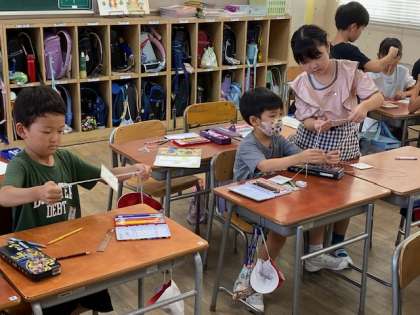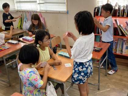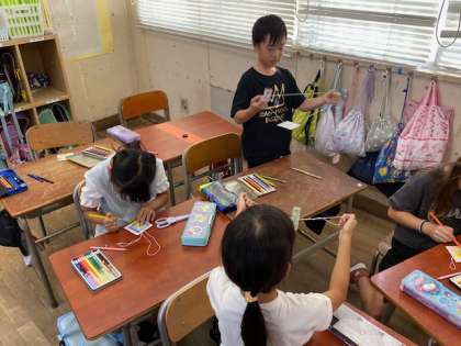自分でデザインした正方形の厚紙に凧糸を通して作るのですが、穴に糸を通せない、通した後は糸が結べない、ぶんぶんゴマが上手く回せないと、四苦八苦していました。