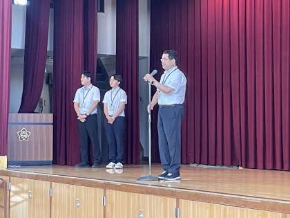 今日の児童朝会では、今日から2週間一緒に学ぶ教育実習の先生が校長先生から紹介され、それぞれの教育実習の先生があいさつをされました。
