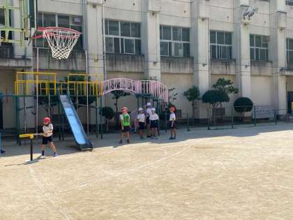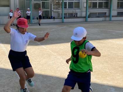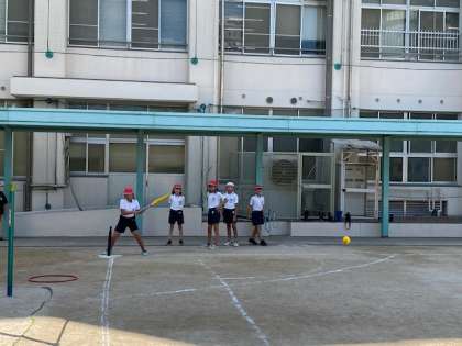 4年生の体育では、『Tボールのホースゲーム』に取り組んでいました。