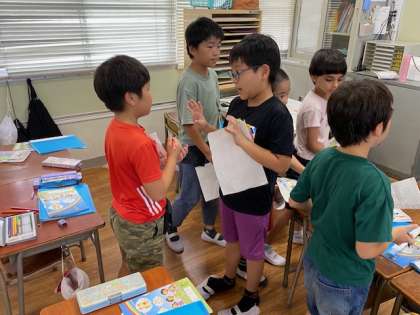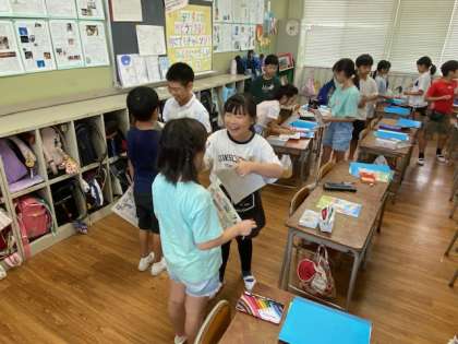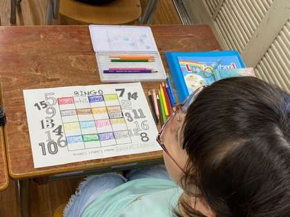 3年生の外国語活動では、『What color do you like?』ということで、自分の好きな色を選び16のマスの中に書いていきます。友だちに好きな色を英語で尋ねて答えた色を自分の用紙に書いた色と合えば丸をつけることができます。10人から聞いてビンゴを目指します。