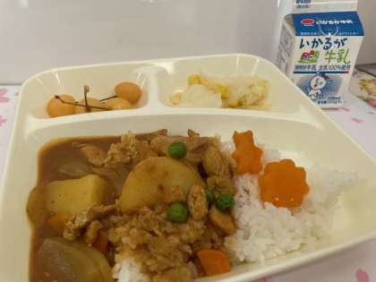 チキンカレーライス キャベツとコーンのサラダ さくらんぼ(缶)