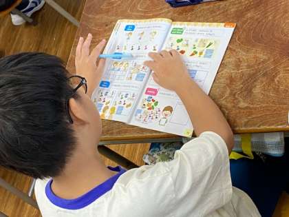 3年生の外国語活動では、教科書に出てくる3人の子の好きなスポーツ、好きではないスポーツについてヒアリングして当てていきました。