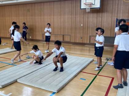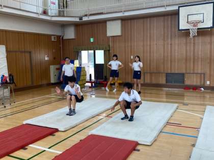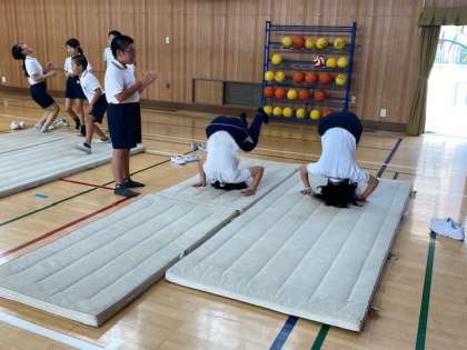 6年生の体育では、今週火曜日に各グループで計画を立てた『音楽に合わせたマット運動』を、体育館で実践してみました。