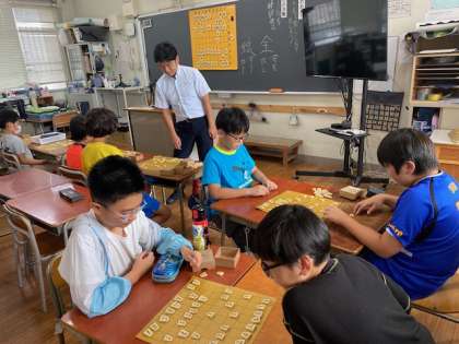 将棋クラブでは校区に住むプロ棋士の方にお越しいただき、対局の面白さについて手ほどきをしていただきました。何人も相手に指導対局をされましたが、子どもたちのセンスの良さに感心されるひと幕もありました。