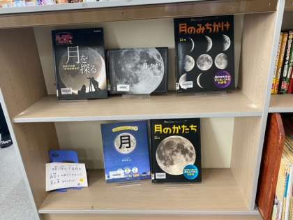 今日も次の新しい本を借りるため、一つ一つの本を見ていました。図書室に入ったところには、今週は十五夜ということもあって、月に関する方が並んでいました(^^)
