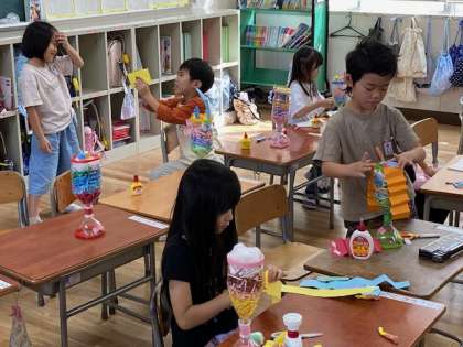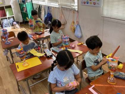 1年生の図工は、先週から取り組んできた色とりどりのパフェもいよいよ完成をむかえました。
