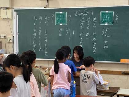 今日習った漢字は、『近』と『引』。丁寧に、正しく書けているか確認しようと先生の目が光ります。