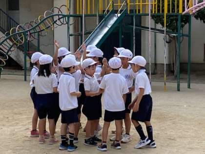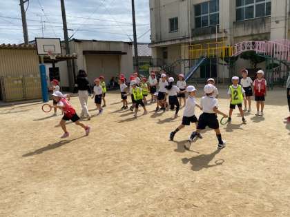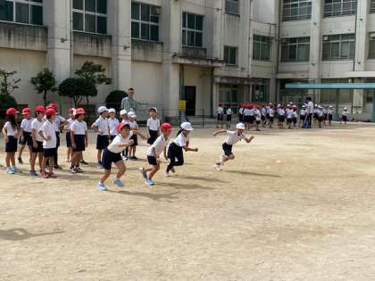 2年生の体育では、短距離走をした後、簡単なリレーに取り組みました。