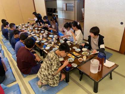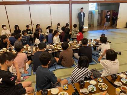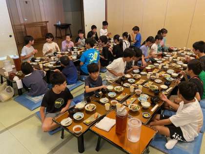 朝食のメニューは、鮭の塩焼き、玉子焼き、かまぼこ、ハム野菜サラダ、イカそうめん、ご飯、味噌汁、海苔、おつけもの、りんごジュースです。