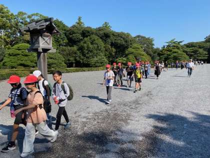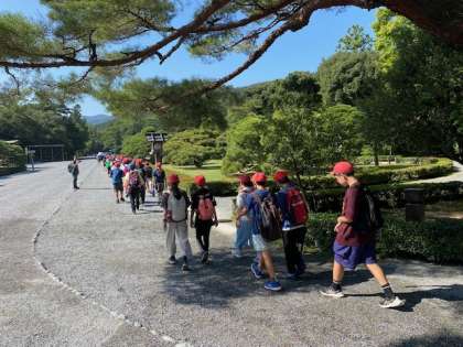 歴史と神秘に包まれた荘厳な空気が子どもたちを静かに迎え入れました。玉砂利を踏みしめながら、木々のざわめきと鳥のさえずりが響くなか、歩みを進めます。