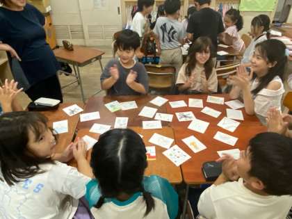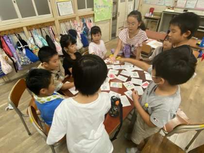 クラスが3つのグループに分かれてから、まずジャンケンをして親を決めます。親になった子は「カラフルな絵」とか「かわいい絵」などと言うと、他の子はそれに見合うカードを集めるというもの。