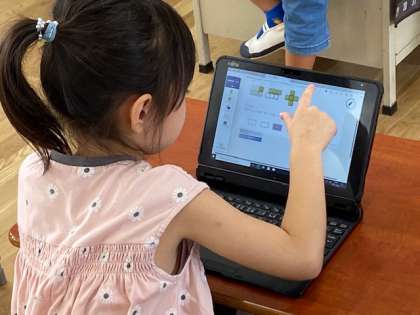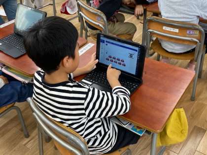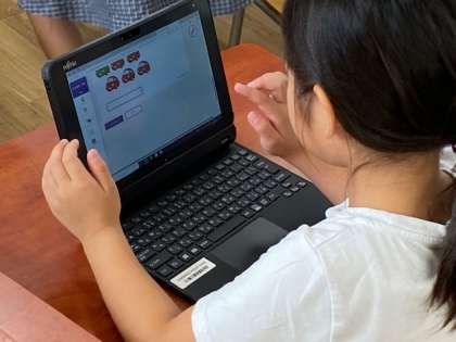 1年生の教室をのぞいてみると、学習者端末で学習アプリ『ナビマ」を立ち上げ、これまで学んできた『たし算』の練習問題にチャレンジしていました。