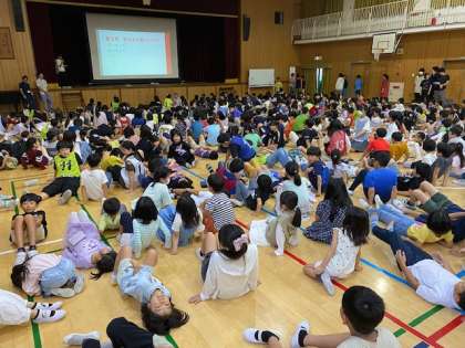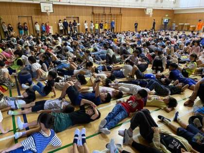 問題に対して、なかよし班で答えを考えます。答えは立ったり座ったり寝たりと、自分の姿勢で表現します。