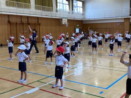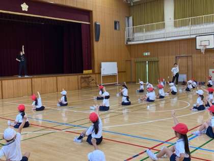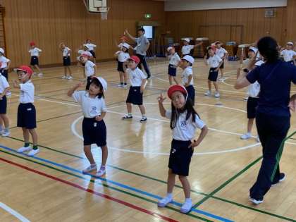 先生が見本を示し、子どもたちが一つひとつ見よう見まねで踊ります。