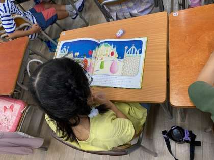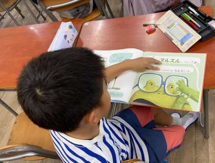 2年生の教室をのぞいてみると、絵本を読んでいるところでした。