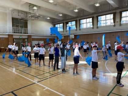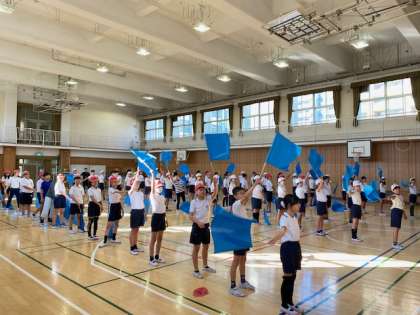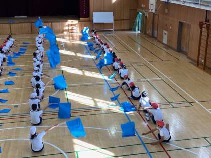 6年生は、運動会で披露する団体演技について、特に全体で息を合わせるところ、時間差で振っていくところを入念に練習しました。