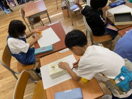 1年生の算数では、前回の続きとして、箱や筒の形を画用紙に写し取ることにチャレンジしました。