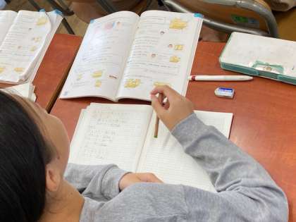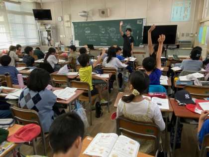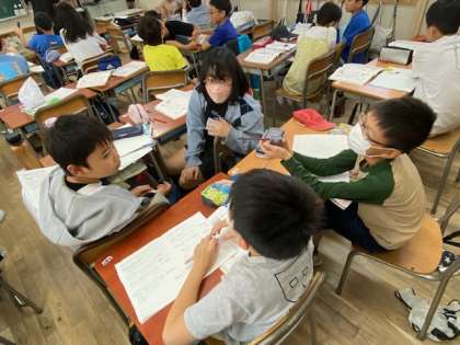 先生の問いに対して答えが見つからない子が多い場合は、周りの人と相談し、考えを共有しながら答えを見出していました。