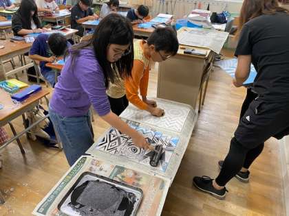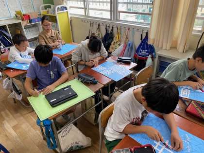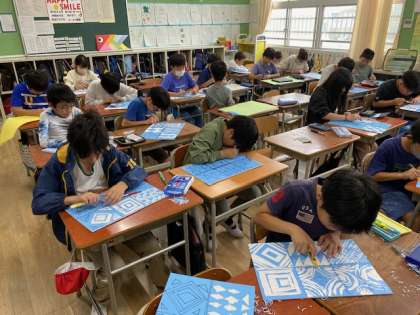 5年生の図工では、(アフリカの)ルワンダとの交流を進めていますが、今日は、ルワンダの工芸として親しまれているデザイン『イミゴンゴ』を版画にして印刷しました。
